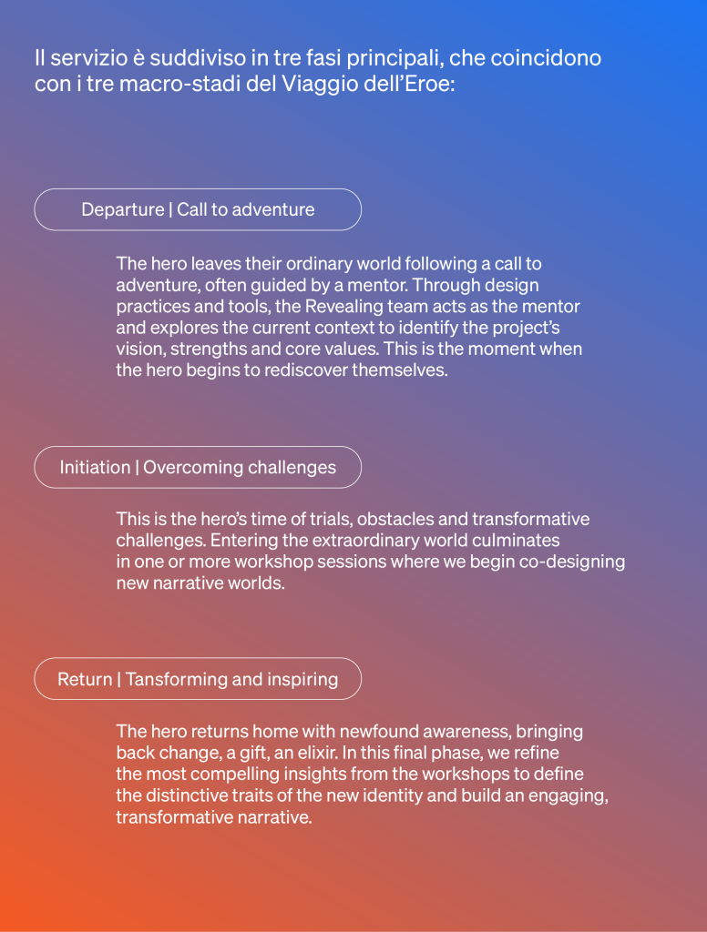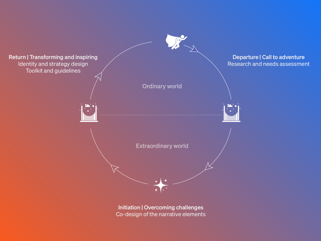 We drew inspiration from the Hero’s Journey, a universal narrative model that describes a protagonist’s path of transformation. We reinterpreted it through a design lens, turning its narrative arc into a structured and participatory process.