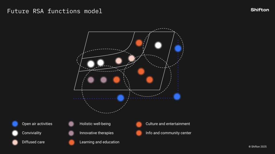 Following the strategic workshop, we developed with our project partners an initial proposal outlining the functions and services of the future Nursing Home: spaces for innovative therapies, training paths, outdoor activities, outpatient services, food areas, a gym and a library. These are open, protected and multifunctional spaces designed to enable a Nursing Home conceived as a living, dynamic and territorially connected common good.
