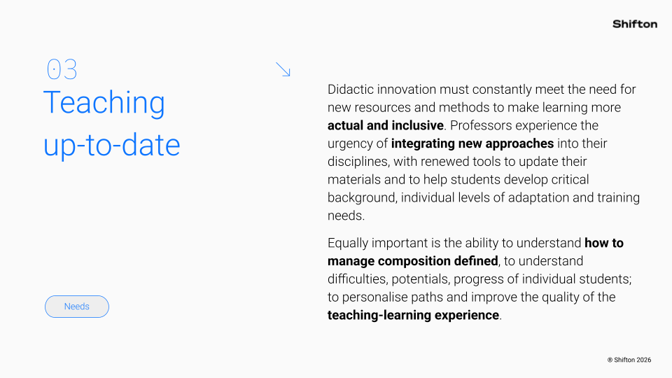 The work produced a set of concrete practices, organised around four directions: promoting student participation, automating to reclaim time, simulating real scenarios, personalising teaching. Looking at these four clusters, a significant piece of data emerges: professors focused on the aspects that today generate the most frustration, those most difficult to manage or to carry out as one would like. It is precisely in these areas that the contribution of AI is imagined. From here, the need to rethink the professor’s role: from holder of knowledge, a figure with strong control over content, to a facilitator of learning, capable of designing engaging formative experiences and enabling students to use tools with a critical spirit.