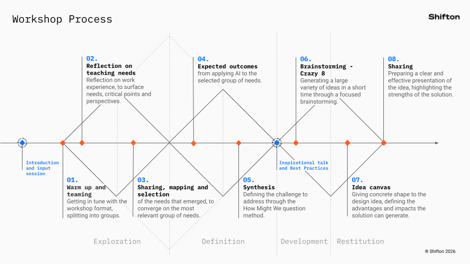We accompanied professors in designing concrete actions to integrate AI into teaching, starting from reflection on their own needs. The methodological framework integrated design thinking activities and labs, with the aim of building on experiences already present in the room and opening up to new possibilities.