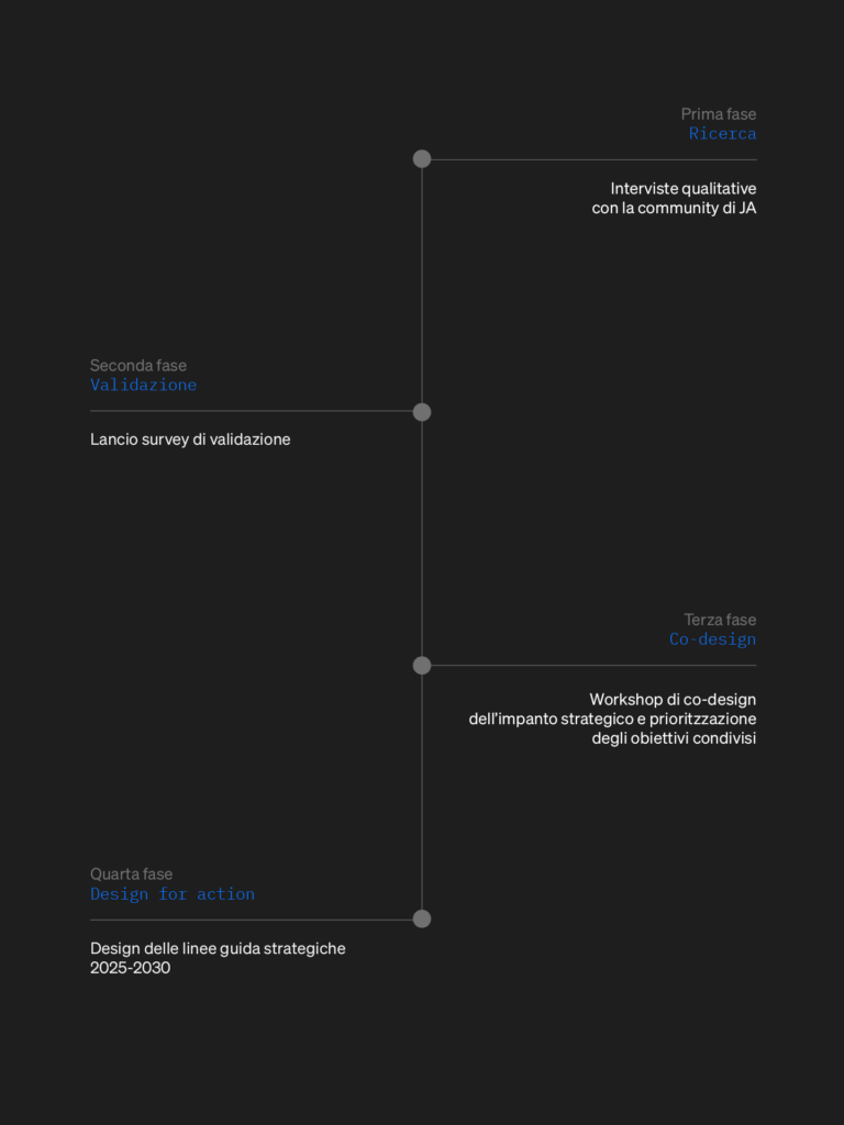 La sfida è consistita nella traduzione di questa prima visione in un impianto strategico operativo e condiviso. Per farlo, abbiamo messo al centro la community di JA Italia – volontari, professionisti, docenti, e studenti – accompagnandola in un processo partecipato di validazione e co-progettazione, con l’obiettivo di attivare un cambiamento sistemico a livello educativo.