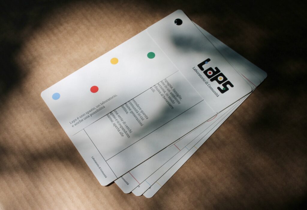 A completare lo storytelling di LAPS, due artefatti: un fan deck, strumento narrativo e visivo pensato per comunicare l’identità e gli obiettivi del laboratorio di comunità in modo immediato e coinvolgente, e un pitch progettuale che raccoglie una descrizione sintetica del progetto. Insieme, fan deck e pitch offrono a LAPS gli strumenti per raccontarsi, generare interesse e supportare momenti di attivazione di nuove collaborazioni strategiche.